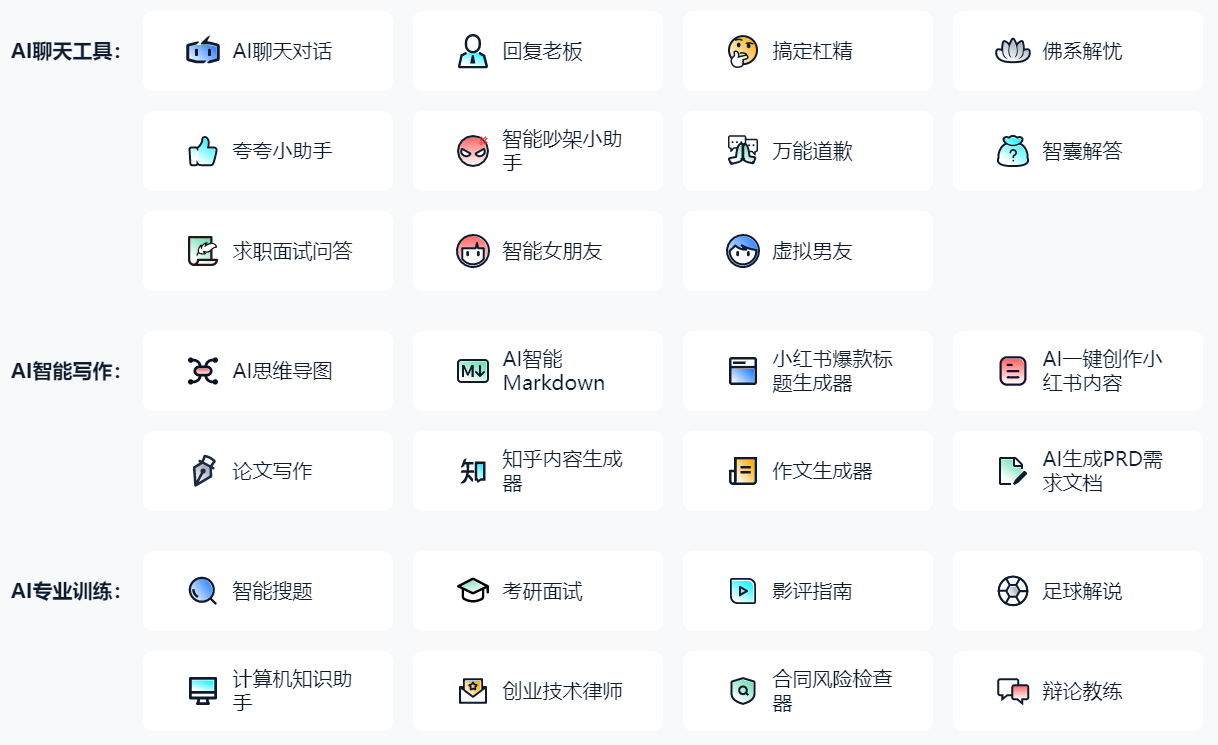 AI代码帮手:代码生成器、R编程注释器、机械进修工程师、全栈软件开辟、VBA代码帮手、Python代码生成、代码纠错、Swift代码生成。智能写做:AI思维导图、AI智能Markdown、小红书爆款题目生成器、AI一键创做小红书内容、论文写做、知乎内容生成器、做文生成器、AI生成PRD需求文档。沟通无妨碍。AI文娱:emoji脸色从动生成、小红书添加脸色、取名神器、脱口秀梨园子弟、占星师、私家厨师、好评神器、诙谐答复。